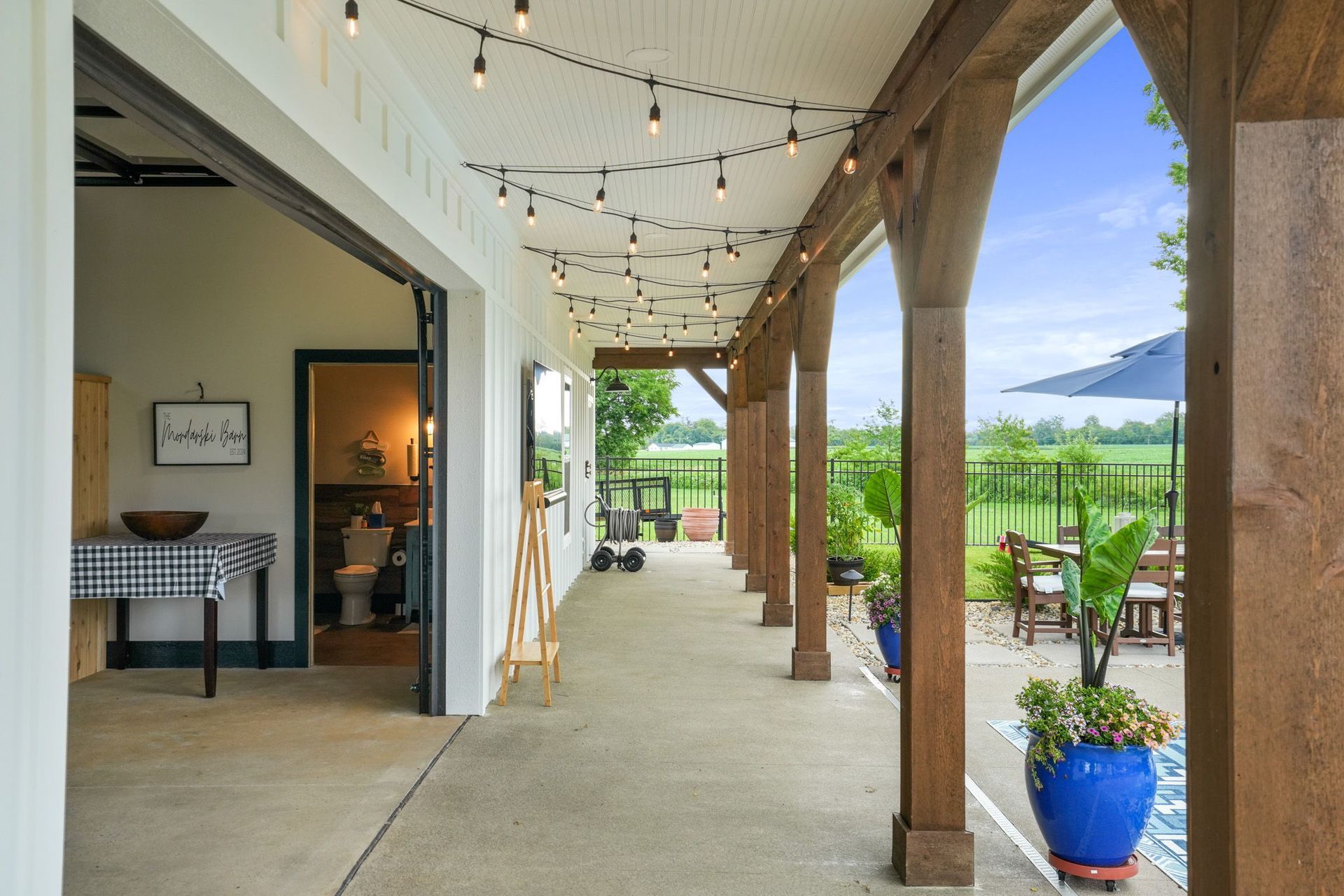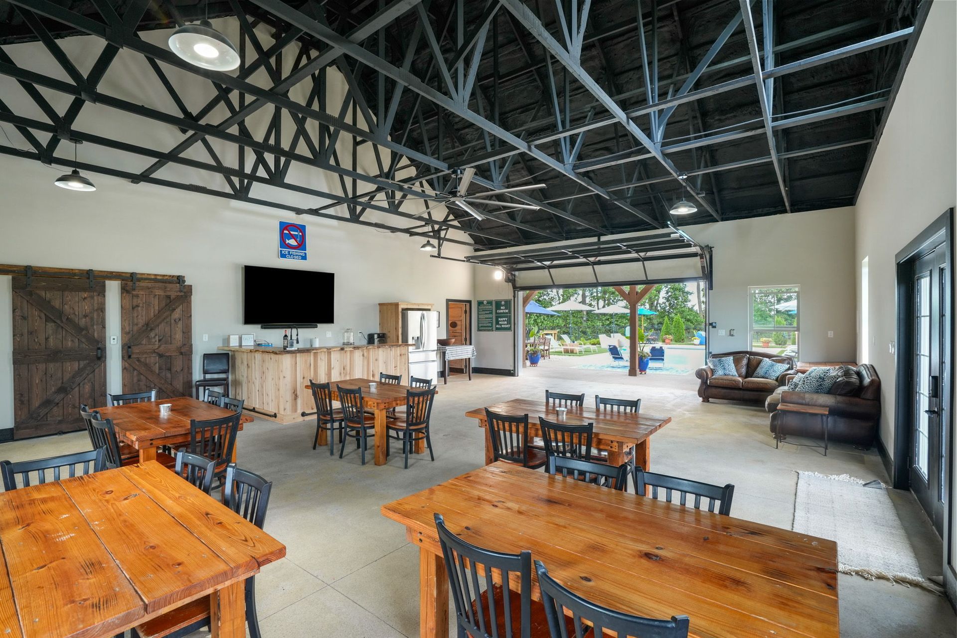 Enhancing the entertainment space, a 16-foot glass garage door blurs the line between indoors and out, opening to a cedar-finished porch overhang perfect for shaded lounging. Every detail—from the bespoke craftsmanship to the thoughtfully integrated luxury features—was designed to provide an elevated, private escape.